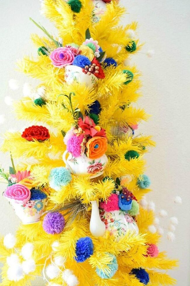 Sunshine-colored branches burst with personality, showcasing adorable ceramic teacups dancing alongside whimsical pom-poms and delicate felt flowers.
