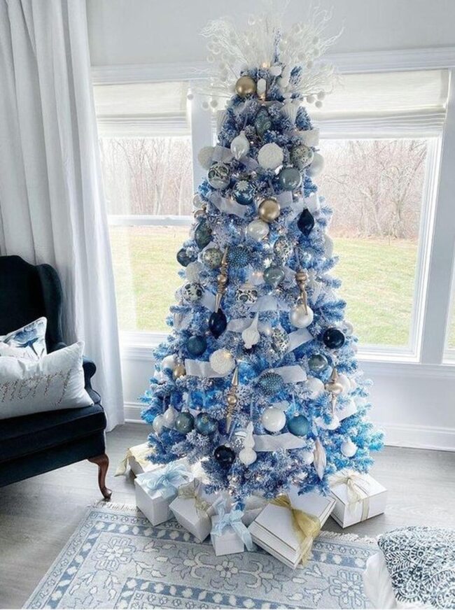 Delicate blue and silver gifts rest underneath, promising joy and excitement for everyone who sees them.