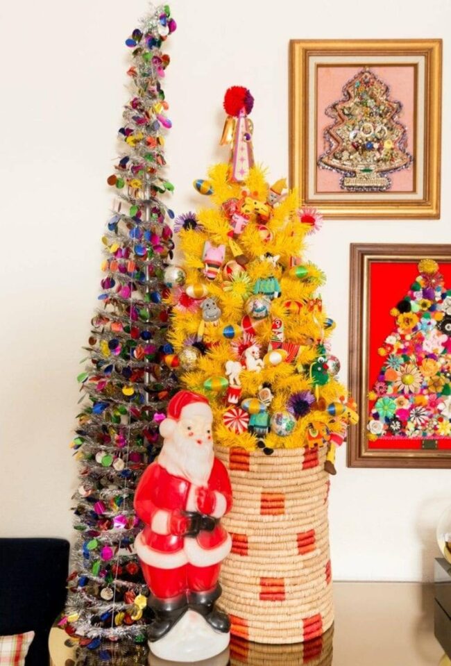 Small companion trees and festive accessories create a playful scene that breaks away from standard holiday expectations.