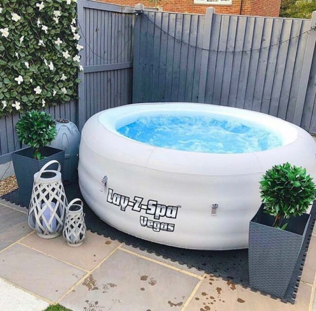 Premium interlocking rubber tiles underneath the inflatable tub create a safe, polished foundation for ultimate relaxation.