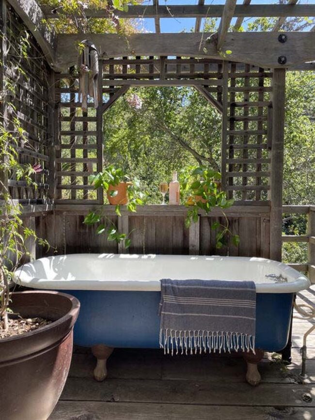 Luxury outdoor bathing reaches new heights with a rustic claw-foot tub perfectly positioned under a charming pergola, creating an enchanting personal retreat.