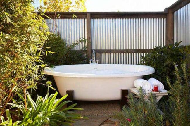 Metal tub materials offer durability and timeless aesthetic appeal, making this outdoor bathing design both practical and visually stunning.