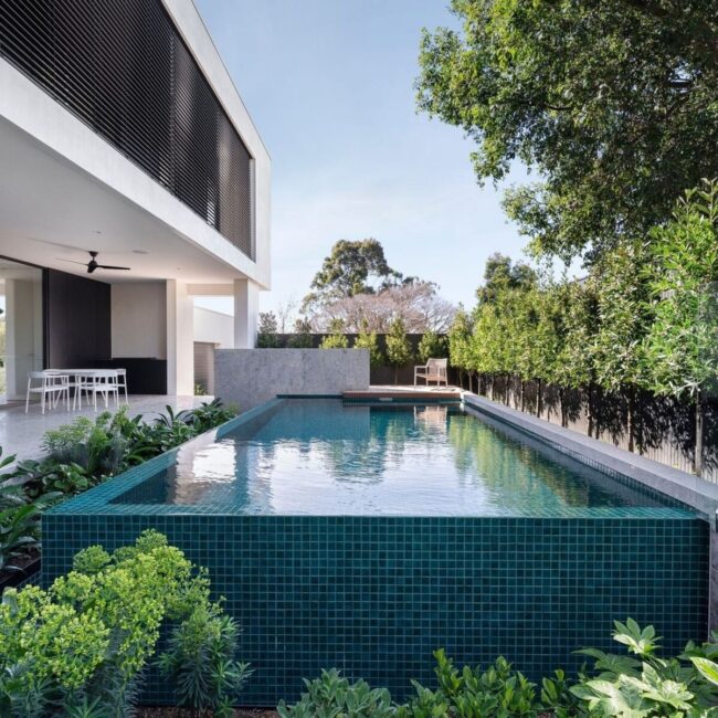 Pool design experts recommend concrete platforms with green ceramic tiles to craft a luxurious backyard sanctuary that elevates outdoor living spaces.