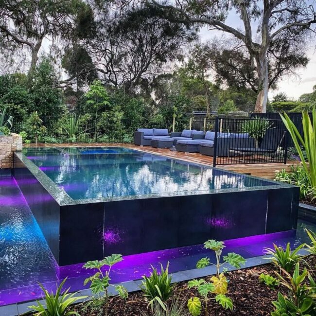 Illuminated swimming pools elevate backyard experiences into magical nighttime retreats, casting enchanting purple and blue glows across shimmering black tiles that beckon swimmers after sunset.