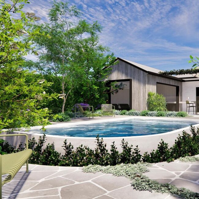 Surrounding greenery like ornamental grasses, shrubs, and native plants can soften pool edges and enhance visual appeal.