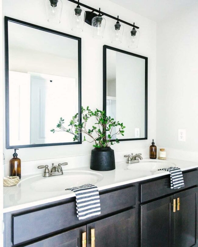 Black framed mirrors create dramatic contrast against gentle wall tones.