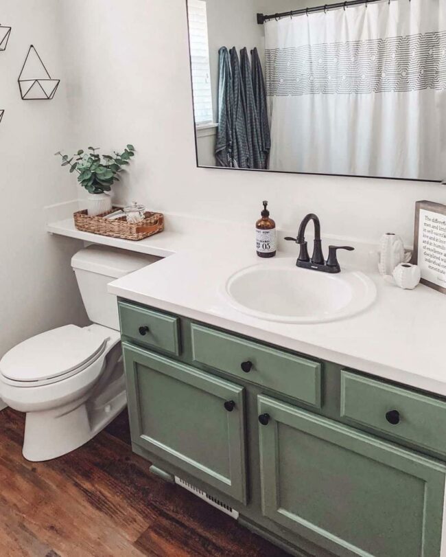 Sage green cabinets radiate tranquility in this charming bathroom, creating an instant sense of peace.