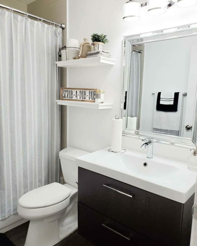 Painted vanities complement mounted wall shelves, allowing you to display charming farmhouse decor with elegant simplicity.