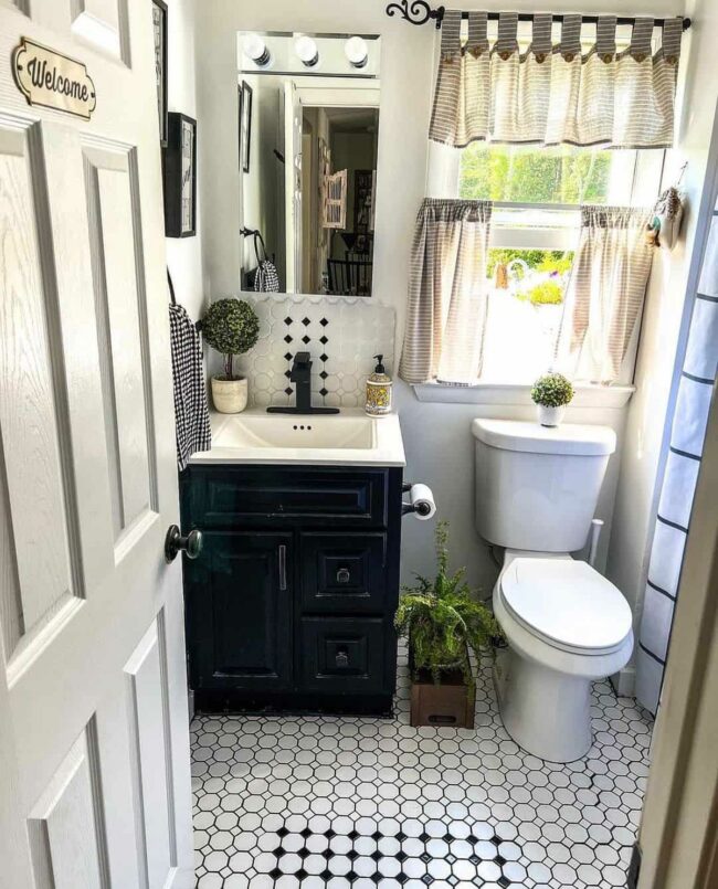 Intricate black and white floor tiles inject artistic personality into every corner of the room.