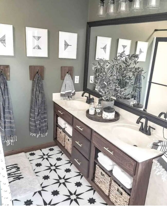 Modern farmhouse charm defines this bathroom's allure, where charcoal hexagonal tiles dramatically anchor the design beneath natural wood finishes.