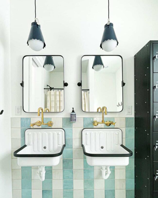 Black light fixtures mounted above mirrors inject an unexpected edgy element that catches attention.