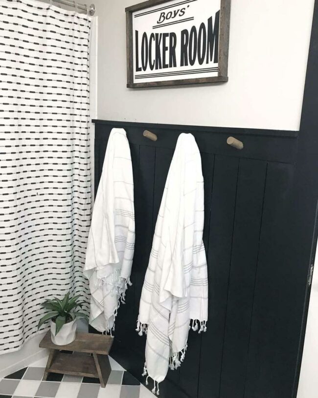 Bold board and batten wainscoting creates dramatic wall contrast that catches attention immediately.