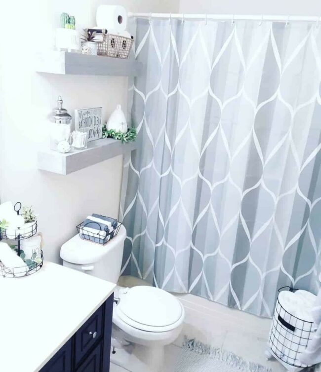 Strategic accents like a coordinating shower curtain ensure design cohesion.