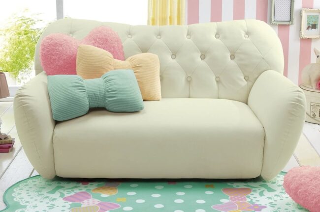 Luxurious bow-shaped pillows adorn the plush overstuffed sofa, echoing a chic feminine design that feels both elegant and whimsical.