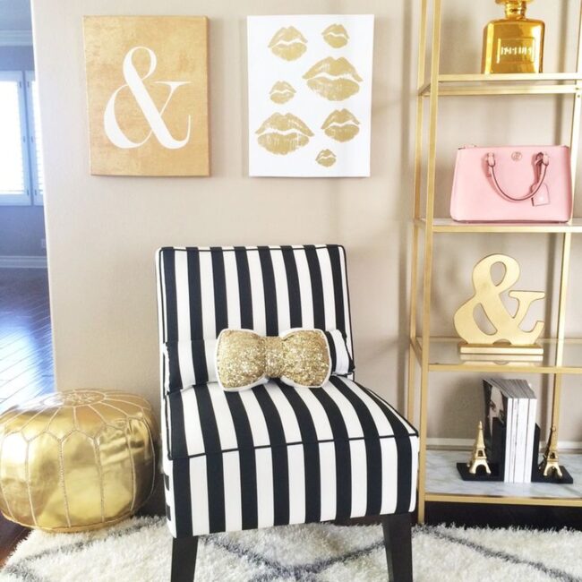 Matching gold metallic pouf anchors the room's aesthetic, complementing sleek surfaces and metallic details.