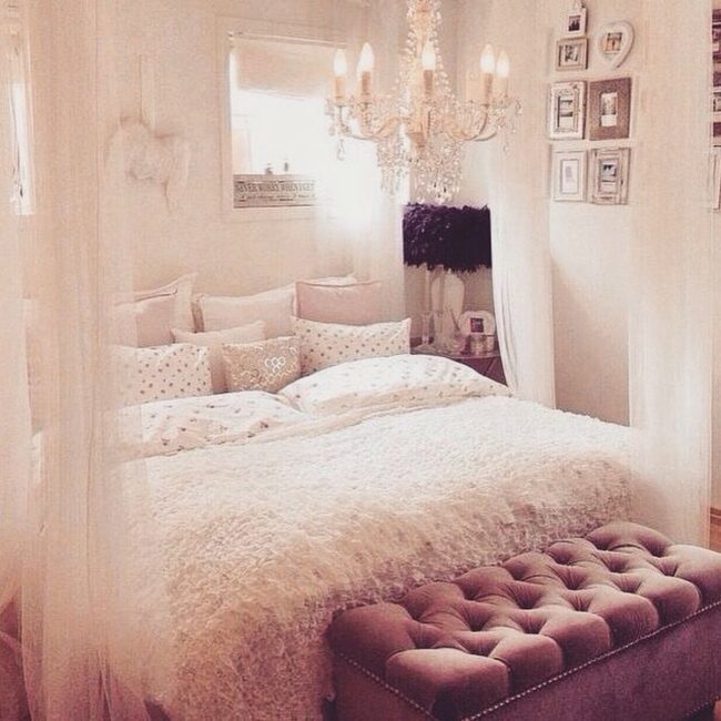 Crystal chandeliers sparkle overhead, casting a magical glow that transforms the room into a heavenly retreat.