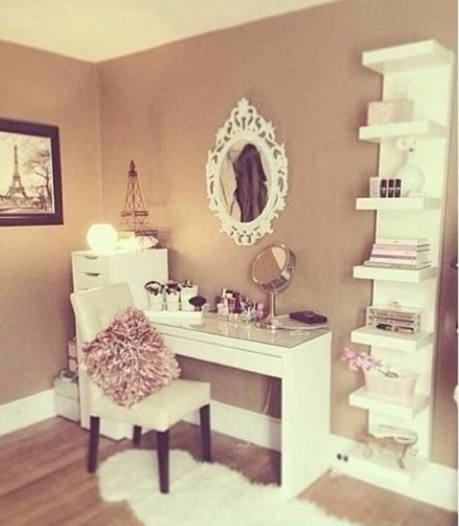 Multiple functions shine in this compact setup, where a vanity and desk coexist without feeling cramped.
