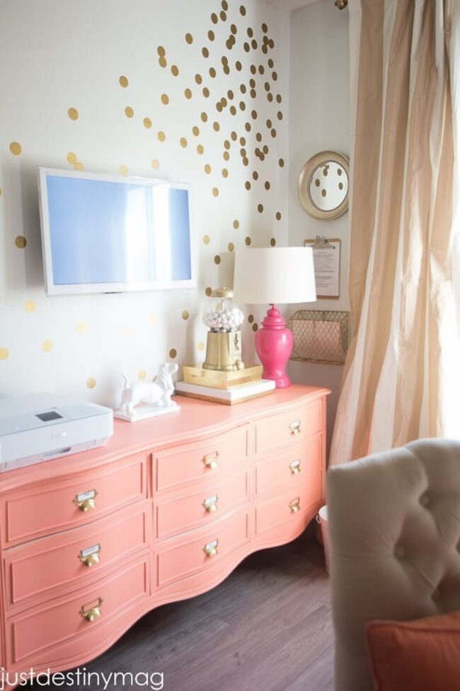 Coral dresser with gold polka dots steals the spotlight, becoming a bold statement piece that electrifies the space and draws all eyes.