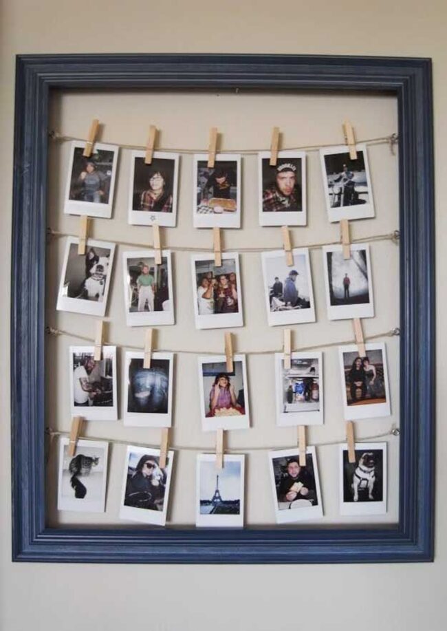 Rustic photo displays have become a charming decor trend that brings outdoor laundry line aesthetics inside your living space.