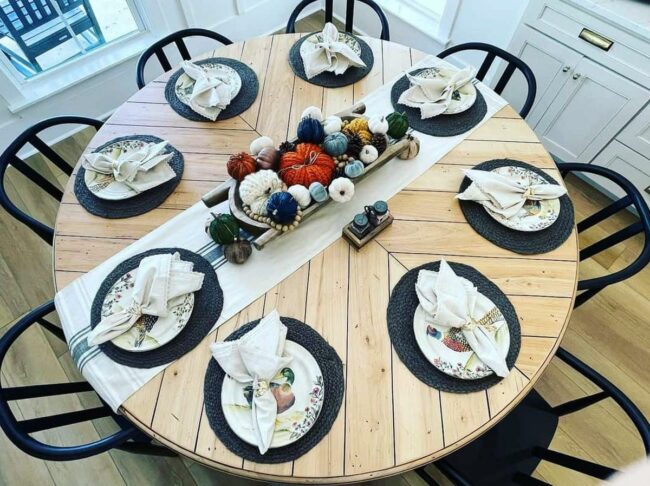 These decorations blend rich colors, natural textures, and seasonal elements to add charm to any round table setting.