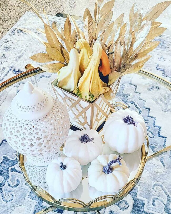 White pumpkins with blue stems perch elegantly atop a gold and glass surface, instantly drawing eyes across the room.