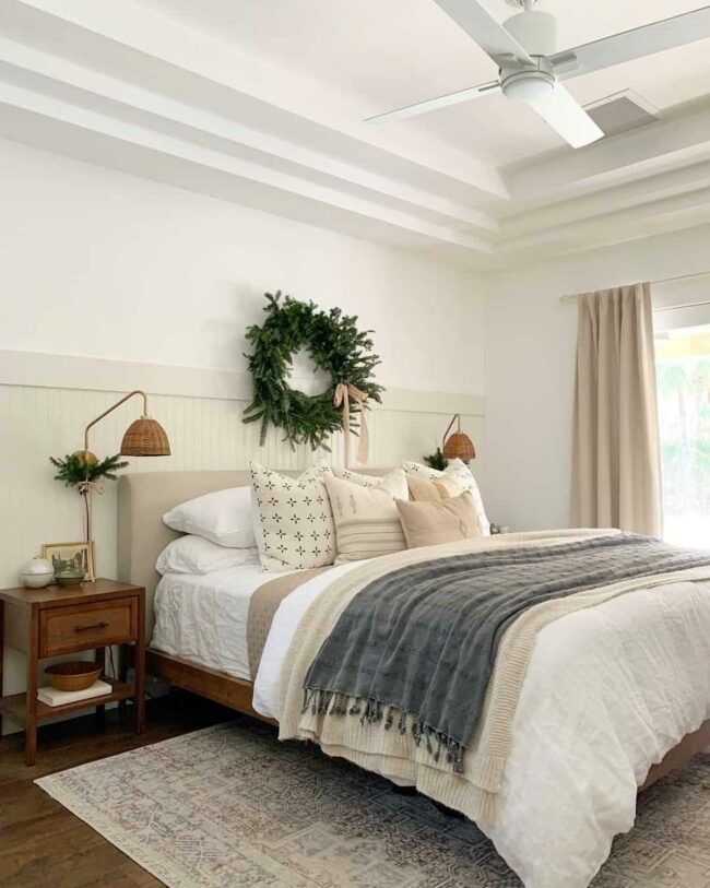 Holiday spirit sparkles through carefully chosen decorative elements like the charming wreath positioned above the bed.