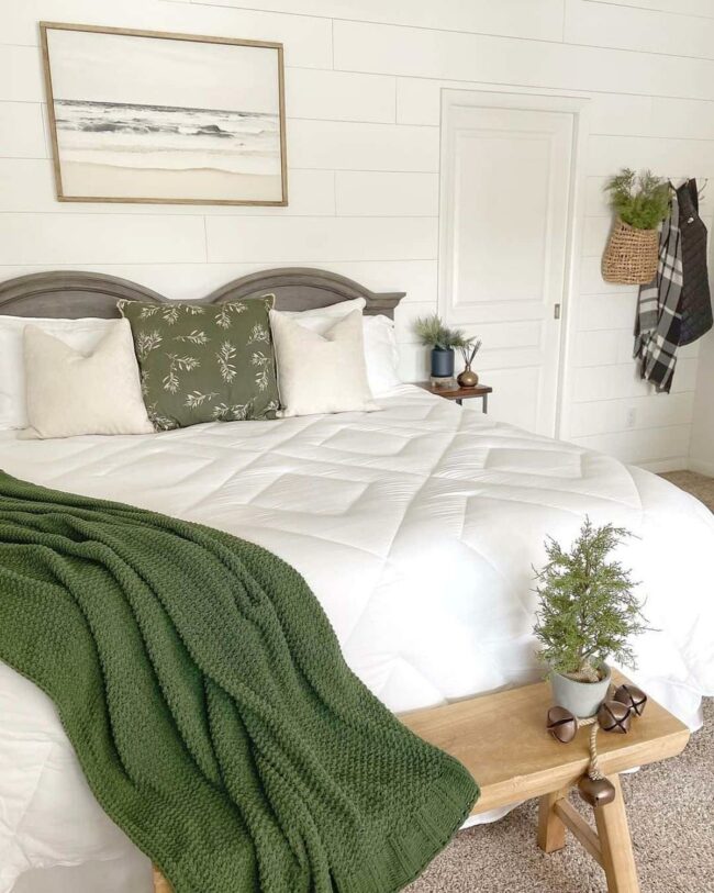 Crisp white bedding becomes a canvas for green and white pillows that refresh the space with natural elegance.