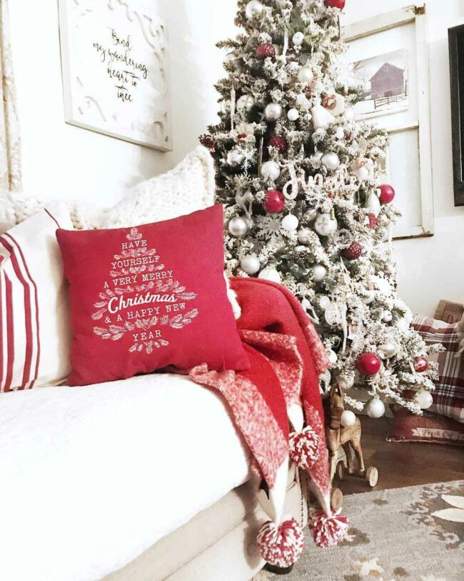 Red and white pillows burst with festive cheer, adding playful color to the scene.