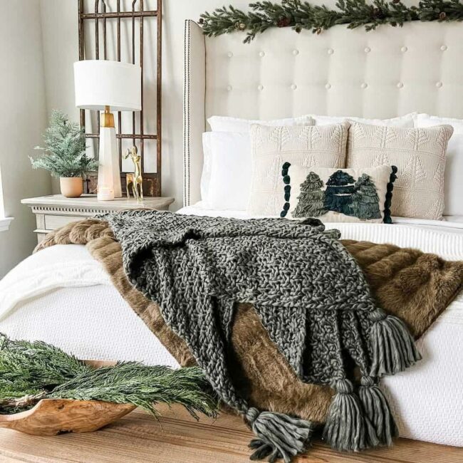Cozy holiday vibes burst through this charming bedroom sanctuary, where a white Christmas throw beckons you to snuggle up with a delightful book.