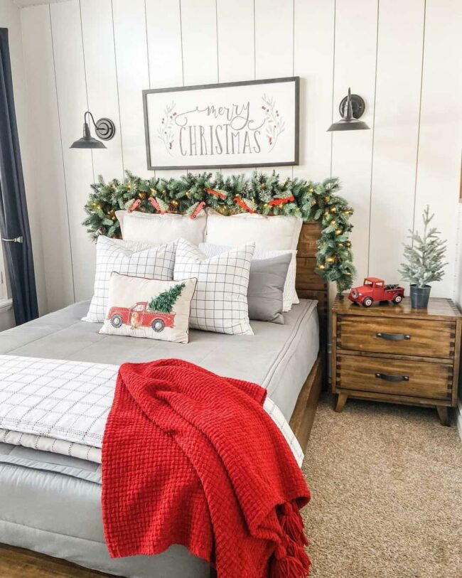 Red Christmas throw blankets electrify gray and white bedding, instantly sparking holiday magic in your bedroom.