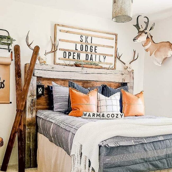 Rustic ski-inspired spaces come alive in this charming bedroom, anchored by a robust wooden bed frame that commands immediate attention.