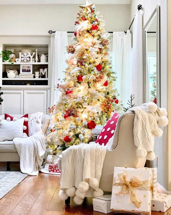 Christmas magic sparkles in this festive retreat where a snowy tree dominates the corner with glistening branches.
