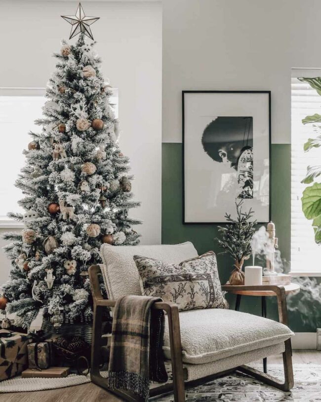 Christmas magic sparkles in this festive corner where a snow-draped pine tree creates a stunning backdrop for a welcoming white armchair.