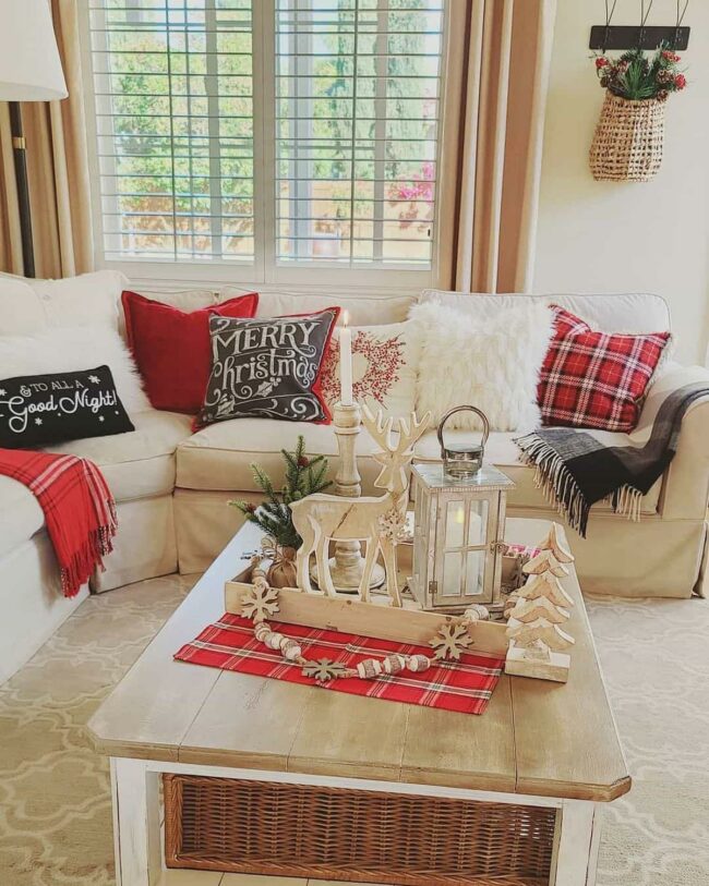 Holiday magic radiates from this welcoming living space, where plaid Christmas throw blankets cascade over an inviting off-white couch.