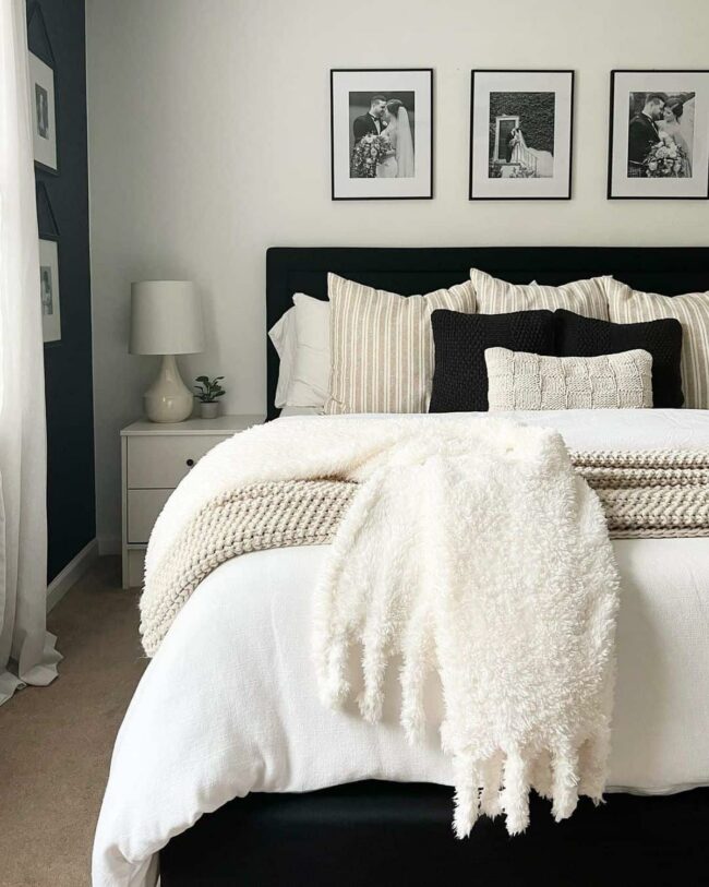 Black and white dominate this bedroom's design, delivering an eye-catching aesthetic that immediately captures attention.