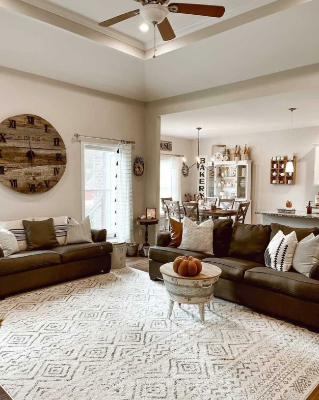 Rich brown leather couches anchor the space, inviting relaxation and comfort with their deep, welcoming tones.