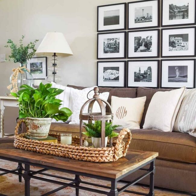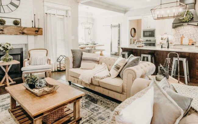 Wooden elements like round end tables and wall signs add natural charm and character to the room.