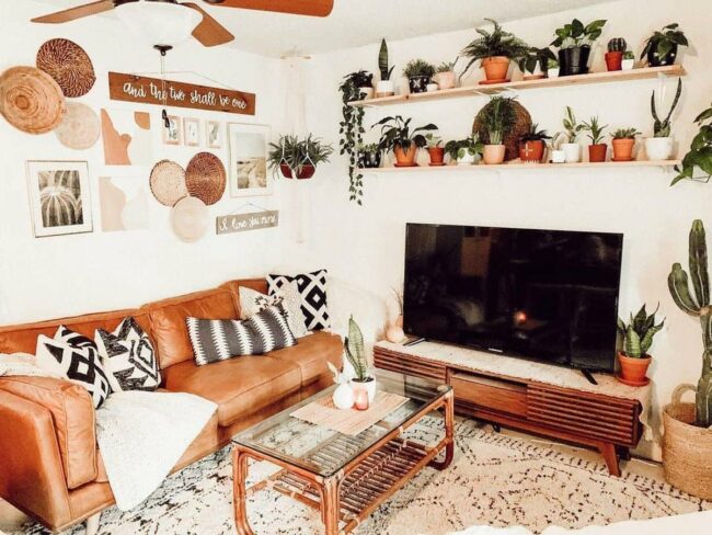 Wooden TV tables anchor the room with rustic charm, while overhead light wood shelves showcase vibrant plants that breathe energy into every corner.