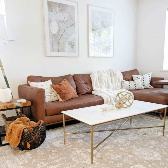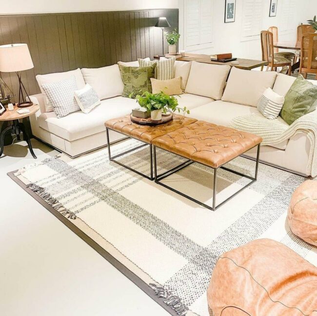 Brown leather pieces create a warm focal point against a beige sectional resting on a gray and white plaid rug.