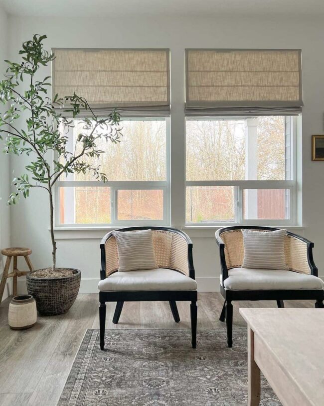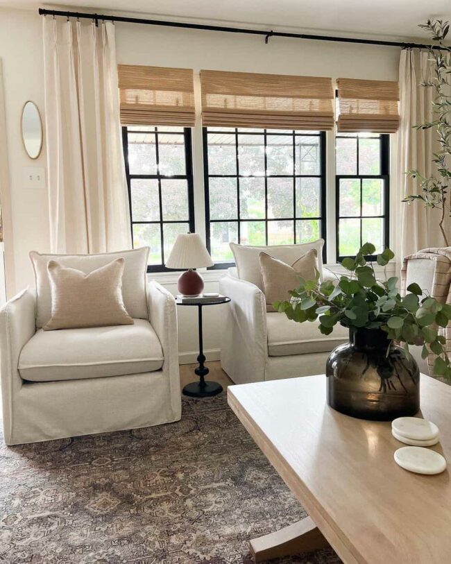 Black frame windows draped in tan Roman shades and ivory curtains create visual depth and softness.