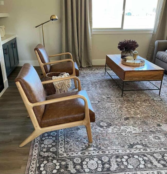 Blond wood coffee table anchors the space, sitting atop a vintage gray rug that adds rich texture and warmth.