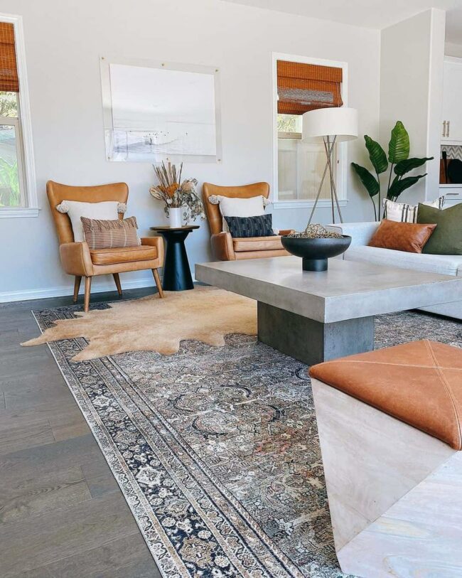 Gray vintage rugs anchor the space with rich warmth and texture.