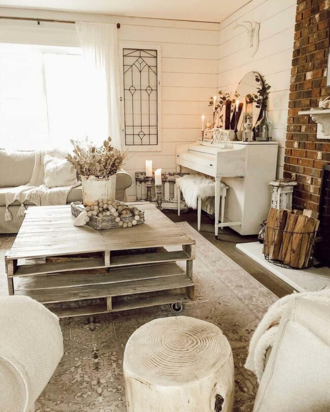 White shiplap walls embrace warmth and rustic charm in this inviting living space.