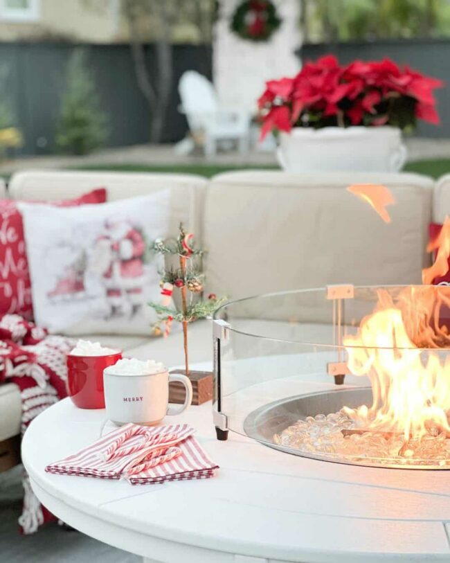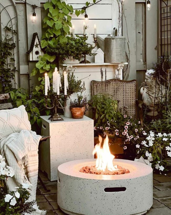 Gentle light and flickering fire promise comfort and connection in this charming outdoor haven.