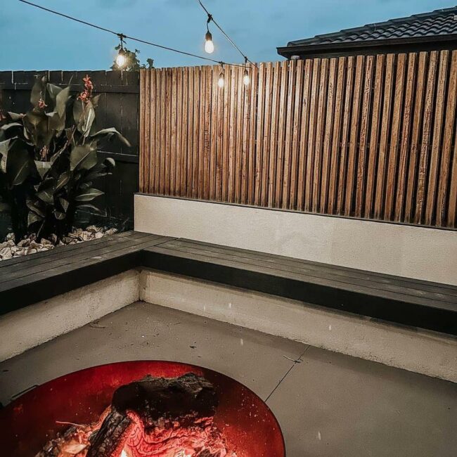 Black L-shaped benches offer comfortable seating against rustic wooden planks, creating an intimate gathering spot.