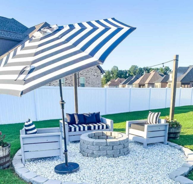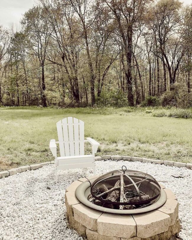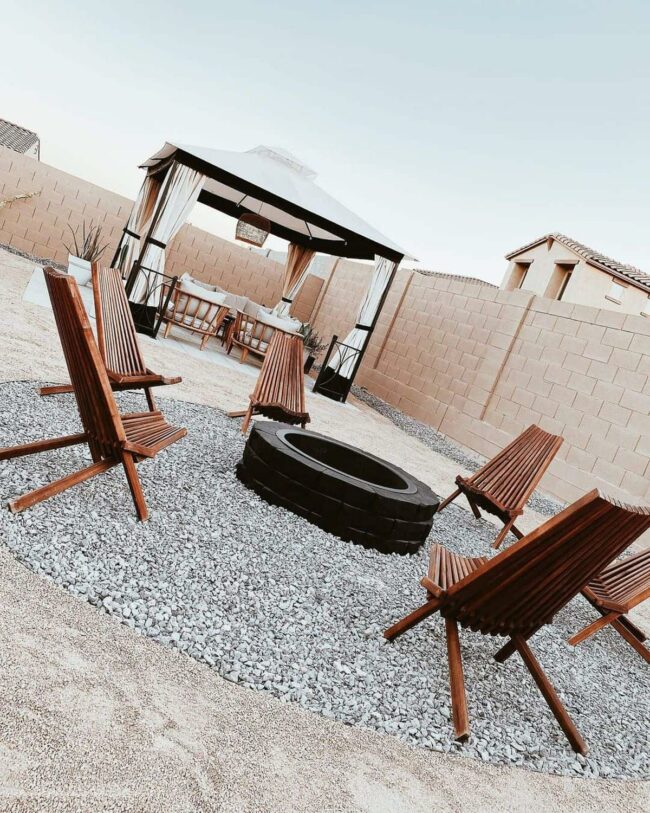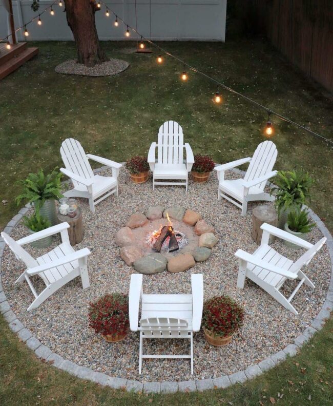 Backyard retreats find their ultimate charm in a light-colored gravel patio centered around a welcoming stone firepit.
