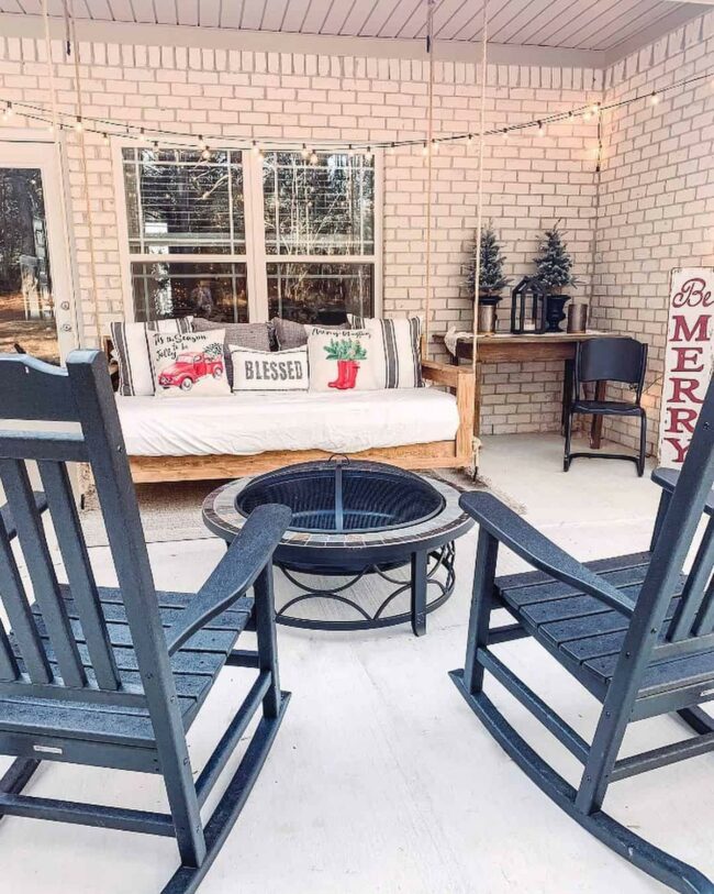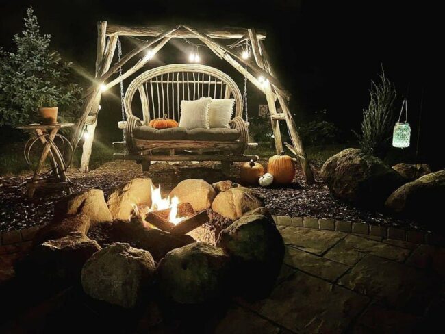 Nearby, a rustic hanging seat beckons with inviting gray cushions and playful white and pumpkin-toned pillows.