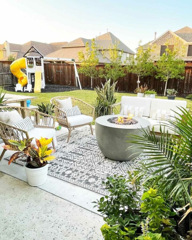 Cement patios create a solid backdrop for epic outdoor experiences around a captivating black fire pit that instantly draws you in.