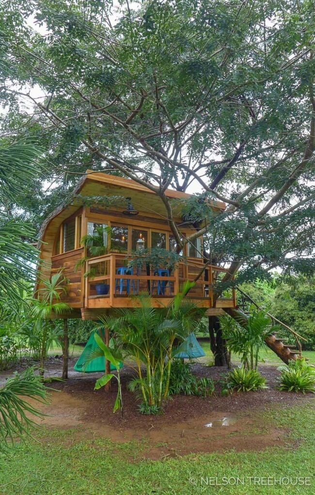 Hanging hammocks beneath the treehouse provide cool, shaded retreats perfect for afternoon napping or quiet reading moments.