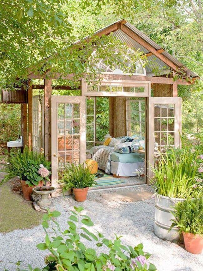 Crafted from carefully repurposed windows, these enchanting spaces capture sunlight and panoramic garden views while protecting you from wind and insects.